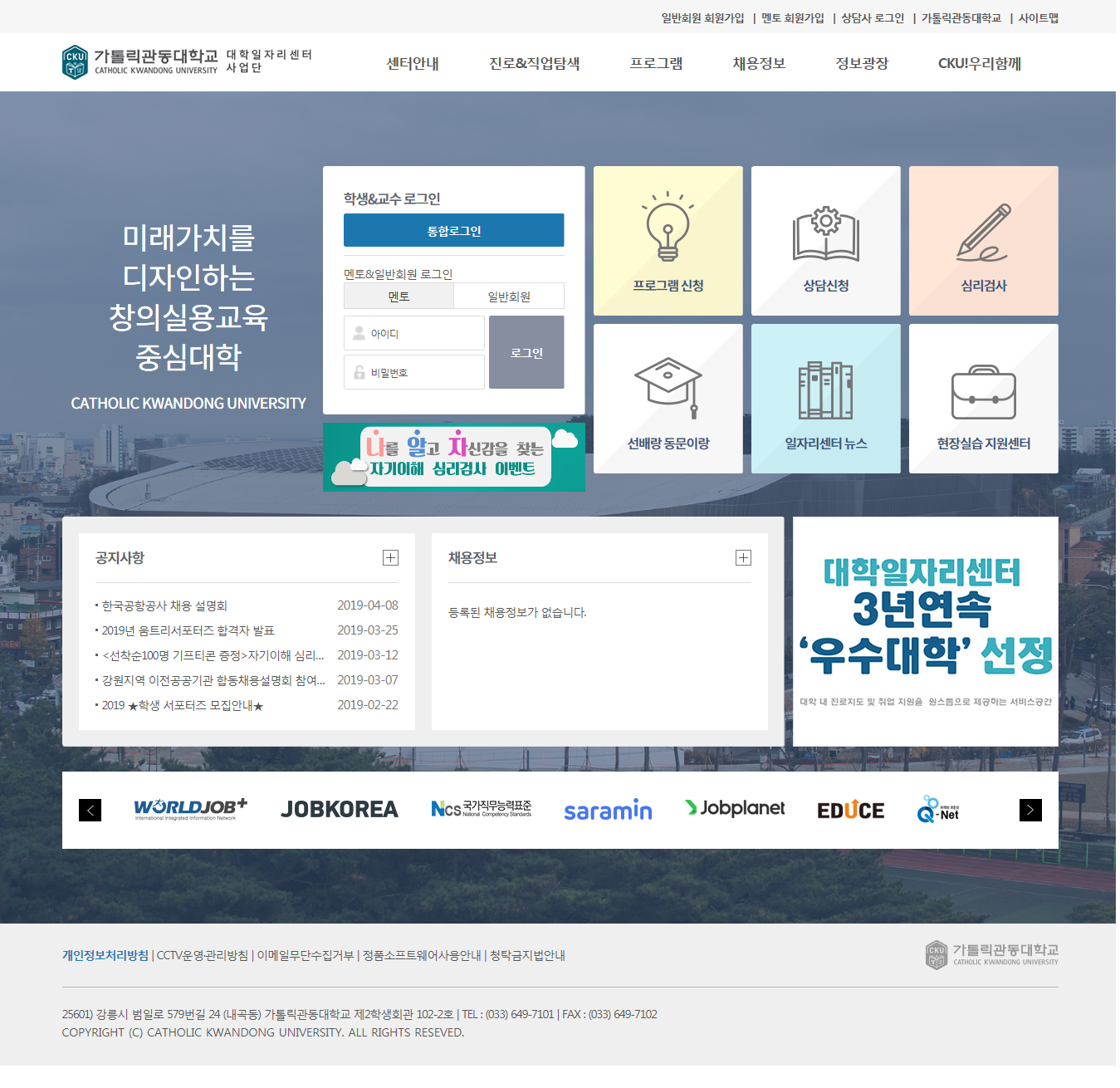 가톨릭관동대학교 대학일자리센터 홈페이지를 신규로 구축하였습니다.